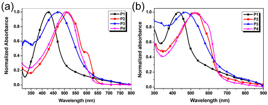 Normalized absorption spectra of P1–P4 (a) in dilute chloroform solution (1 × 10−5 mol/L) and (b) in the thin film state (spin-cast from chloroform solution).