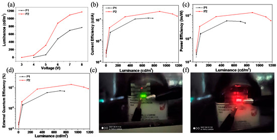 (a) The luminance–voltage (L–V) characteristics; (b) Current efficiency–luminance (J–L) curves; (c) Power efficiency versus luminance plots; (d) External quantum efficiency–luminance characteristics of P1 and P2. (e) The photograph of P1-based device with green emission at 8 V; (f) The photograph of P2-based device with red emission at 8 V.