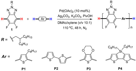 As depicted in Scheme 1, P1–P4 were prepared by Pd-catalyzed direct C-H cross-coupling reaction of 5,6-difluoro-2-(2-hexyldecyl)-2H-benzotriazole (1) with four different thiophene derivatives, including 3-octylthiophene, 2,2’-bithiophene, thieno[3,4-b][1,4]dioxine, and 4,4-dioctyl-4H-silolo-[3,2-b:4,5-b’]dithiophene under the optimized conditions as reported in our recent work [29], namely, Pd(OAc)2 (10 mol%) as catalyst, Ag2CO3 (3.0 equiv) as oxidant, K2CO3 (3.0 equiv) as base, PivOH (2.0 equiv) as additive, and DMAc/xylene (v/v, 10/1) as solvents at 110 °C for 48 h. A branched side chain (2-hexyldecyl) was attached to benzotriazole units, aiming to improve the solubility of compound 1 and the resultant copolymers in the common organic solvents, such as DMAc, DMF, CHCl3, etc. [11]. The results of the polycondensation reactions and the thermophysical properties of P1–P4 were shown in Table 1.