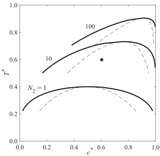 T* = 0.6 (black point) is initially located in the single-phase region, and the degrees of polymerization of the components are equal (