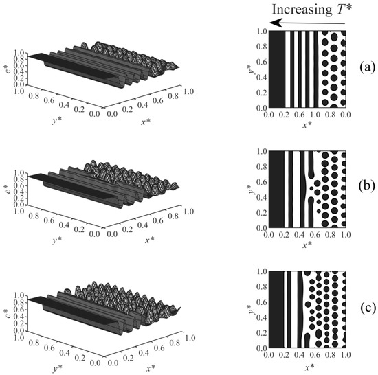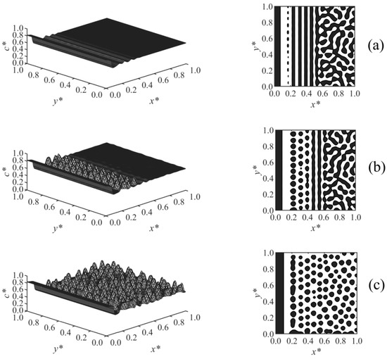 Figure 7a,b, since the phase separation by spinodal decomposition was stronger at the high diffusivity and could prevent the stripes from forming. In the presence of a temperature gradient, the enrichment layer got slightly thinner with increasing diffusivity (