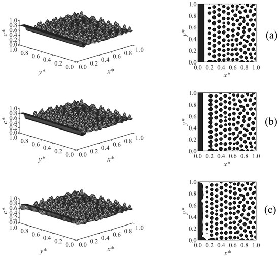 x* = 0. The first column shows the spatial distributions of the dimensionless concentration of solvent