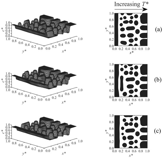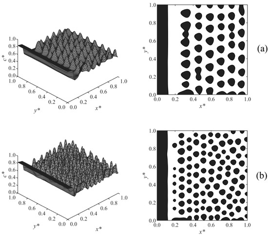 Figure 6, investigated the effect of the diffusion coefficient on the long-range surface-directed polymerization-induced phase separation. A lower diffusion coefficient led to the formation of larger particles in the bulk as expected according to the diffusivity role in phase separation by spinodal decomposition [