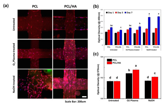 In order to evaluate the biological effects of the surface modification techniques on the 3D-printed scaffolds, we conducted an in vitro study to investigate the cell attachment, proliferation, and differentiation of hDPSCs on the scaffolds. From the fluorescence microscopy images (Figure 3a), the hDPSCs were successfully attached and proliferated on the scaffolds after culturing for 3 d. The hDPSCs on the NaOH-treated scaffold were densely attached and showed an elongated morphology compared to those attached on the untreated or O2 plasma-treated scaffolds. The cell proliferation on the scaffolds was quantitatively analyzed by a WST-1 assay after culturing for 1, 3, and 7 d. On day 7, the proliferation of the hDPSCs cultured on the NaOH-treated PCL and PCL/HA scaffolds increased significantly compared to those cultured on the untreated and O2 plasma-treated samples. We found that the O2 plasma treatment greatly increased the protein adsorption ability of the scaffold which is closely related to cell adhesion [33]. The proliferation of hDPSCs could be influenced greatly by the hydrophilicity of the scaffold.