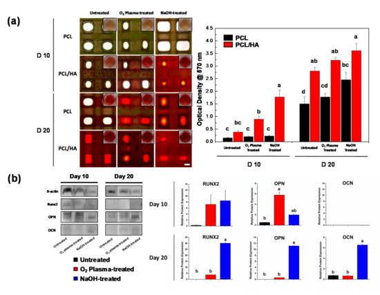The osteogenic differentiation of the hDPSCs on various scaffolds was assessed by the Alizarin Red S staining and the Western blot assay on days 10 and 20 (Figure 4a). Generally, the Alizarin Red S staining method is used to detect the calcified matrix resulting from osteogenic differentiation. Here, the Alizarin Red S stain was further analyzed quantitatively to compare the matrix mineralization. The PCL/HA scaffolds treated with NaOH showed the highest bone mineralization among the samples. The HA particles exposed on the surface provided a bone-like microenvironment that promoted osteogenic differentiation of hDPSCs and consequently increased mineralization [34]. To further identify the enhanced osteogenic differentiation ability of the hDPSCs on the NaOH-treated PCL/HA scaffolds, protein expression of osteogenic differentiation markers was evaluated using a Western blot analysis (Figure 4b). On day 10, expression levels of runt-related transcription factor 2 (RUNX2) on the NaOH-treated PCL/HA were higher compared to untreated and O2 plasma-treated PCL/HA. RUNX2 is known as a modulator of early osteogenic differentiation in osteoblasts. RUNX2 binds with the cis-acting element of the osteocalcin (OCN) promoter region to trigger OCN expression [35]. On day 20, the expression levels of RUNX2, osteopontin (OPN), and OCN were highest in the NaOH-treated PCL/HA scaffold. An increased expression of osteogenic differentiation-related proteins indicated the ability of hDPSCs to differentiate into osteoblast cells [36]. These results illustrate that the HA particles exposed by the NaOH treatment played an important role in the osteogenic differentiation of hDPSCs.