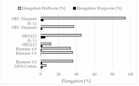 Elongation values (warp and weftwise) of fabric samples ((b.t.)—before thermal treatment).