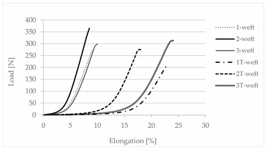 The elongation at break of the fabric samples in the weft direction after thermal treatment increased dramatically and almost reached the level of knitted fabrics. It can be seen that the fabrics obtained an elongation of about 15% under the load of only 10–20 N, which is three times that of the untreated fabrics (Figure 7).