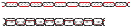 We also studied the changes in elastic properties of woven fabrics and cotton series with the addition of two different sequences of viscose/PBT yarn in the weft direction and different weaves to achieve better elastic properties. Viscose/PBT core yarn was 10 × 2 tex (50/2 Nm) with PBT 5.6 tex in the core, where the PBT contributes 28% of yarn mass. Six samples were designed and produced, with different sequences of viscose/PBT combinations in every fourth and fifth weft and in three different weaves (rows 5, 6, and 7 rows in Table 1, Figure 3). After weaving, all fabrics were thermally treated—boiled in distilled water for 30 min and dried for 24 h in a state of free tension [5,17].