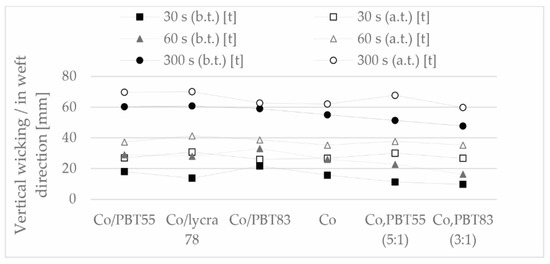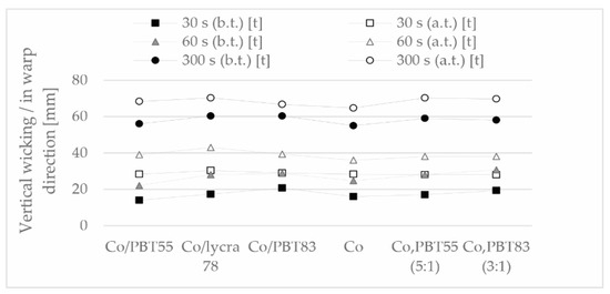 Moisture management (vertical wicking) of the samples in warp direction (measures distance in mm at a certain time), before (b.t.) and after (a.t.) thermal treatment.