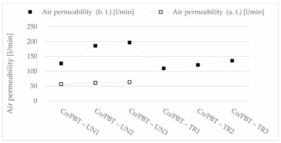 The use of Lycra and PBT in the fabric construction contributes to the closure of the fabric structure in both cases; only Lycra does this more intensively and immediately after weaving, PBT after thermal treatment. However, the decision of which material to use also depends on other desirable physical, mechanical, and permeability properties of fabrics, taking into account the simplicity of manufacture (ease of production), maintenance, durability, and price.