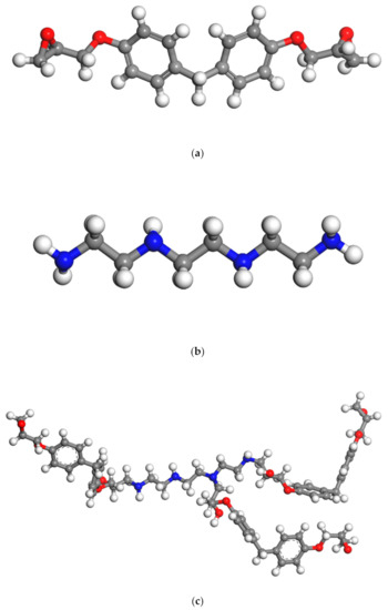 Illustration of (a) molecular structure of the considered epoxy resin (EPON862) and (b) curing agents (TETA) and (c) prepared representative monomer of EPON862/TETA (diglycidyl ether of bisphenol F/triethylenetetramine). Oxygen: red; carbon: gray; nitrogen: blue; hydrogen: white.