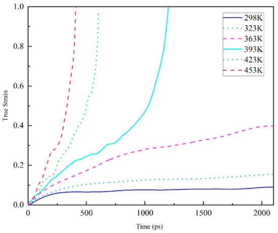 From Figure 4, a series of points were obtained after averaging, and finally we get the glass transition temperature of the epoxy resin structure about 410 K from the curve obtained after corresponding fitting. This glass transition temperature is basically consistent with the results of other researchers through molecular dynamics simulations [19]. This result shows the rationality of the epoxy resin model structure established in this article, and the appropriate temperature can be selected for further research based on this. In this paper, six different temperatures were selected under and above Tg (410 K), 298 K, 323 K, 363 K, 393 K, 423 K, 453 K, and the creep behavior of epoxy resin was simulated more systematically by uniaxial constant stress tension in the temperature range of 298–453 K.