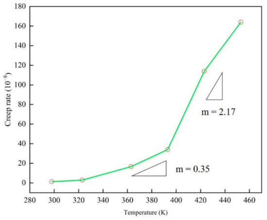 In Figure 9, two peaks can be observed. The creep rate slope n is 16.89 at low stress, and in the high stress state, the value n increases to 150.35, where n is the stress index. Please note that the change of the exponent n here is consistent with the stress gap observed earlier. In Figure 8, the slope m of the creep rate is 0.35 below the glass transition temperature, and this peak increases to 2.17 when it is higher than the glass transition temperature. It should be pointed out that the change of the peak value here is consistent with the effect of the relationship between service temperature and glass transition temperature on the creep of epoxy resin. Here, the creep slope at different temperatures is similar to that under different stress states, indicating that there is also a temperature gap, which reveals the nonlinear relationship between creep rate and temperature.