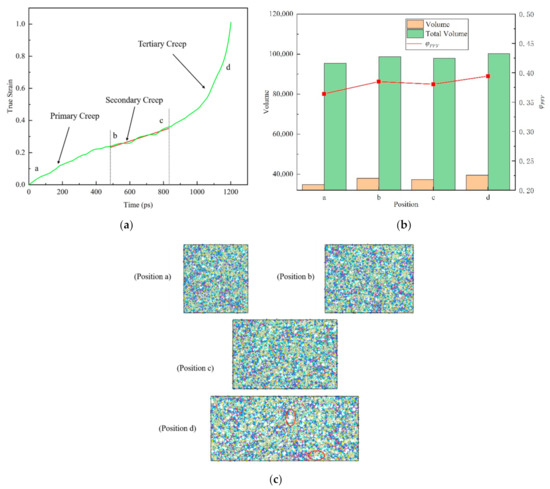 In Figure 10b, the free volume ratio of epoxy resin does not show obvious monotonous change during creep near the glass transition temperature, showing a relatively stable state. This is due to the fact that the molecular chain of epoxy resin polymer is in the glassy state near the glass transition temperature, and the range of motion is so small that it is difficult to change the free volume. At the same time, we noticed that the free volume decreases during the change from b position to c position. This can be interpreted as preventing the flow of molecular segments of the material during deformation, when the material shows a brittle mechanical response. However, as is shown in Figure 11b, the evolution of free volume in tensile creep process under high stress at room temperature shows a different phenomenon. In detail, both the total volume and the free volume increase with the progress of the creep process. Further study found that the proportion of free volume in the creep process of epoxy resin gradually increased.