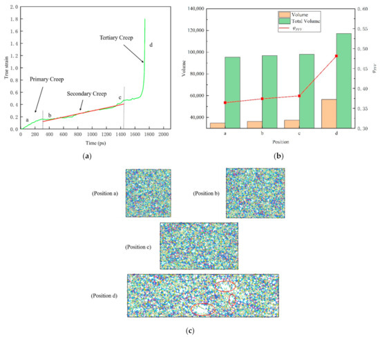 The relationship between real strain and time shows the different creep stages of amorphous polymer epoxy resin model near the glass transition temperature (at 393 K, about 0.96 Tg) under 100 MPa tensile stress. (a) Three stages of creep (primary, secondary and tertiary). (b) Total volume, free volume and the proportion of free volume at the corresponding position of the model. (c) Snapshots of the atom at the corresponding location. The red ellipses represent the voids. Among them, a position represents the initial, b indicates the beginning of the second (steady-state) creep, c indicates the beginning of the third creep, and d indicates the rapid change of the real strain.