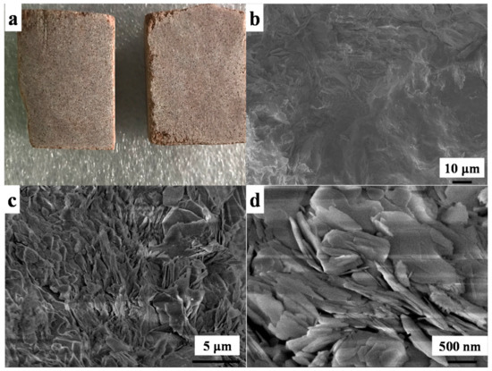 The sandstone was cut into 3 cm × 3 cm × 2 cm (length × width × height) (Figure 1a) and the electronic image of the sandstone pieces showed that the surface was not smooth. The surface morphology of the stone was characterized by SEM (Figure 1b–d) showing that the sandstone was not smooth (Figure 1b) and it was composed of many flakes with the length of around 1 to 3 μm (Figure 1c) while the thickness was less than 100 nm (Figure 1d). These accumulated nano flakes formed a compact laminar microstructure and microporous structure. This unique structure enabled the mechanical strength and the gas and water permeation property which is a promising option for stone heritage material.