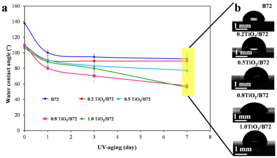 Surface wettability characterization via measuring the water contact angle; (a): the effects of TiO2 loading on the wettability of Paraloid B72 after UV light irradiation; (b): digital images of the water contact angles on TiO2/Paraloid B72 composite coatings.
