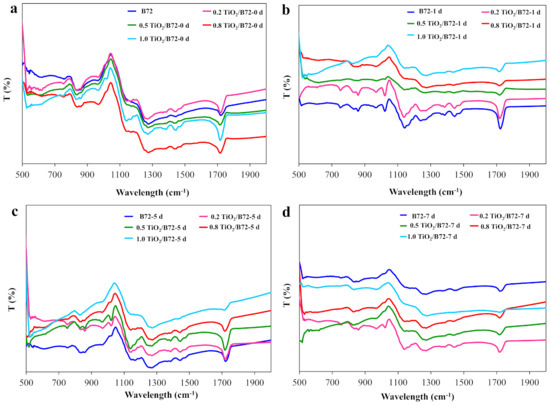 Fourier transform infrared (FTIR) spectroscopy characterization of TiO2/Paraloid B72 composite coating before and after UV irradiation; (a): 0 day; (b): 1 day UV irradiation; (c): 5 days UV irradiation; (d): 7 days UV irradiation.