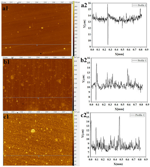 We selected 0.5TiO2/B72 as a model to illustrate the change of surface roughness before and after UV irradiation (Figure 7). As shown in Figure 7(a1), the surface of 0.5TiO2/B72 is relatively smooth and the roughness line in Figure 7(a2) reflects the fact that the surface is smooth without apparent peaks and a significant valley was detected. After irradiation for 5 days under UV light, the surface became rough with many particles dispersed on the surface (Figure 7(b1)) compared with the surface before UV irradiation (Figure 7(a1)). The roughness analysis indicates that there many small peaks formed on the surface after 5 days UV irradiation and the height ranges from nanometers to several micrometers (Figure 7(b2)). Continually increasing the UV irradiation time, many small particular-like structures were observed on 0.5TiO2/B72 coatings after 7 days’ UV irradiation (Figure 7(c1)). This was confirmed by the roughness line analysis that the surface is composed with many small peaks with the height less than 2 μm (Figure 7(c2)) and larger peaks can also be found which might be due to the TiO2 nanoparticles being extracted from the matrix after long UV irradiation (Figure 7(c2)).