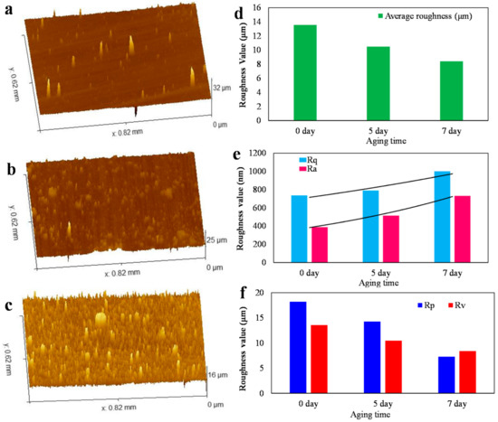 To accurately evaluate the effects of irradiation time on the surface morphology and surface roughness, three-dimensional (3D) surface profiles, the whole surface area average roughness, the arithmetic mean surface roughness (Ra), root-mean-square roughness (Rq), maximum peak height (Rp) and maximum valley depth (Rv) of 0.5TiO2/B72 coating under the UV irradiation of 0 day, 5 days and 7 days were measured (Figure 8). As shown in Figure 8a, the surface of the original 0.5TiO2/B72 was relatively smooth with several small peaks which might be attributed to the aggregation of TiO2 nanoparticles. After being irradiated for 5 days and 7 days, the 3D surface profiles show that there many aggregations appeared and the aggregations became smaller, finer and higher with the increasing UV irradiation time (Figure 8b,c). The average roughness of 0.5TiO2/B72 coatings was measured showing that the average roughness decreased from 14 μm to 8 μm with the UV irradiation time increasing from 0 day to 7 days (Figure 8d). The reduction of average roughness might be because the longer UV irradiation leading to the generation of more free radicals which cause the degradation of Paraloid B72. To further evaluate the surface roughness, Ra and Rq increased with prolonging UV irradiation time (Figure 8e) showing that the Ra increased from 387. 5 nm to 731.5 nm while the Rq increased from 734.6 nm (0 day) to 1000.7 nm (7 days irradiation) indicating the surface is composed with more peaks. With the increment of UV irradiation, both the height of peaks and the depth of valleys decreased (Figure 8f) indicating that the longer irradiation caused the vanish of valleys and the peaks. This is ascribed to more free radicals generated from TiO2 nanoparticles under UV irradiation. These free radicals broke the structure of Paraloid B72 caused the degradation of Paraloid B72 and the reorganization of the polymer matrix, thereby fining the surface structure.