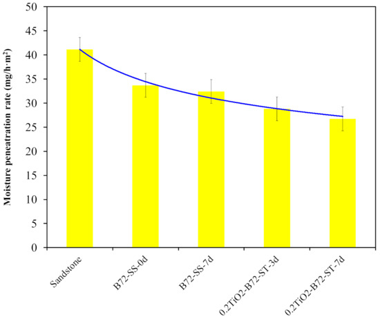 The adverse effects of the TiO2 photocatalytic property on the polymer matrix can also be verified by characterizing the water adsorption performance of TiO2/B72 coatings after UV irradiation for different days. As shown in Figure 9, the water adsorption capacity of sandstone was 41 mg/(h·m2) and it decreased to 35 mg/(h·m2) after it was coated with Paraloid B72 and the water adsorption capacity continuously dropped with the addition of TiO2 nanoparticles and UV irradiation. This result illustrates that adding TiO2 nanoparticles into Paraloid B72 caused the decrease of water permeation capacity. This can be explained by the photocatalytic property of TiO2, in that the photo generated free radicals not only decomposed the deposited organic compounds at the surface but also degraded the polymer matrix leading to the reduction of pore numbers and the pore density on the coatings.
