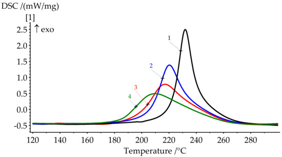 Activation energy varies from 105 to 148 kJ/mol during the curing process that indicates multiple-stage cure kinetics. This type of Ea-dependency could describe either two parallel independent reactions or two competitive reactions. Presence of the peak contributes to independent reactions. However, a constant rise of Ea is usually attributed to competitive reactions. Furthermore, a monotonic change in the peak area that is observed with variation of the heating rate (Table 4) is sufficient evidence of the presence of competitive reactions. As for the small rise of Ea at the final stage of curing, we suppose that it could be related to the diffusion control because this behavior is quite typical for this process and was discussed in many works [41,45,46].
