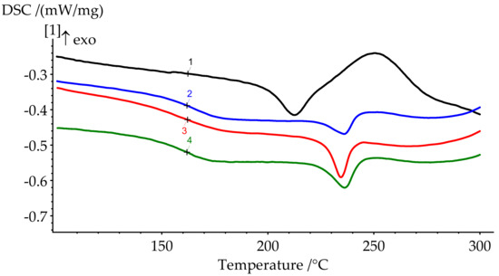 DSC curves of cured samples could also indicate the stability of the materials. The heat release at elevated temperatures usually corresponds to the thermal destruction. The slight rise of the heat flow appears at the end of the runs (Figure 8). Thus, we expect materials to be stable approximately up to 300 °C.
