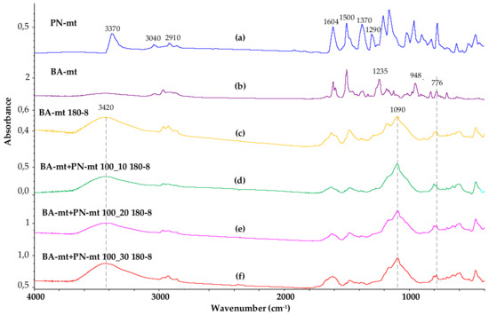 FTIR spectra of PN-mt (a), BA-mt monomer (b), cured BA-mt (c) and cured compositions containing 100 pbw of BA-mt and 10 (d), 20 (e) and 30 (f) pbw of PN-mt.