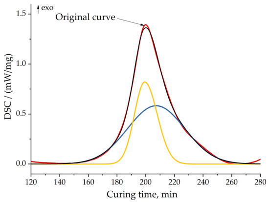 We separated peaks in Fityk software (Institute of High Pressure Physics, Warsaw, Poland). A typical graphic of separated peaks for formulation 2 is presented in Figure 12. The attempt to utilize the competitive reaction scheme, predicted by isoconversional analysis, did not succeed. Only the usage of the consecutive reaction scheme resulted in a quite accurate model of curing. Figure 13 shows the final model fitting for composition 2.