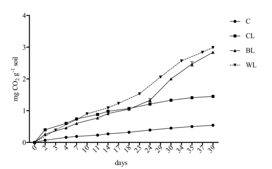The CO2 evolution in the soil samples was followed to determine the course of biodegradation of both lignocellulose-based lubricants (BL and WL) and commercial grease (CL) in comparison with the respirometric profile of the unamended soil sample (C). The results are shown in Figure 1.