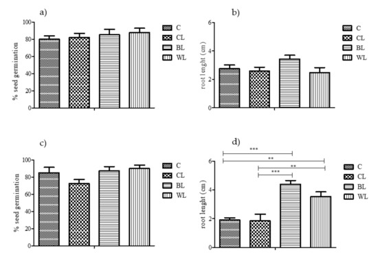 Seed germination percentage and root length of L. sativa in the control (C) and lubricant-spiked soil samples (CL, BL and WL): (a,b) data at t0; (c,d) data at t40 (n = 3, mean data ± s.e.m.). Significant differences at p < 0.01 (**) and p < 0.001 (***) are shown.