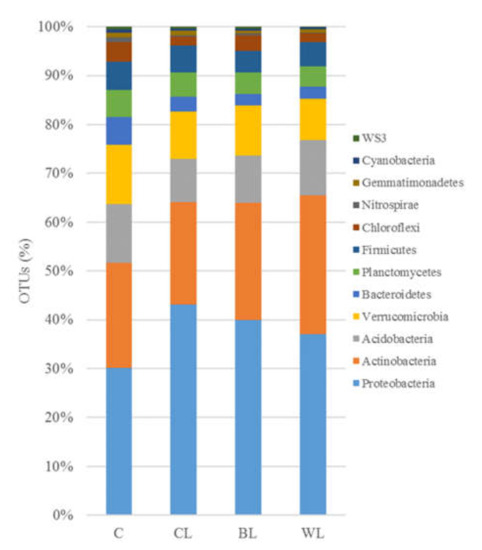 To compare the species richness among the tested samples, the rarefaction curves were generated (97% cut-off). The samples exhibited similar trends and all curves tended to reach saturation; thus, we can assume that the sampling representativeness was high enough to detect most sequence types (Figure S1, Supplementary Information). The Shannon index suggested a similar diversity among the assessed soil samples, although alpha diversity in BL microbiome was lower than in control sample (C) (Table 2).