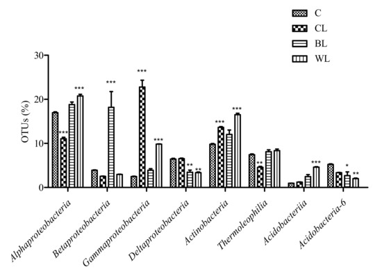 The Actinobacteria phylum was significantly overrepresented in the sample WL (28.3%), while it showed decreased abundance in OTUs affiliated to Verrucomicrobia phylum, compared to control soil (C) (Figure 3). At the class level, Actinobacteria taxon was increased within microbial communities of CL and WL soil samples (13.6 and 16.5%, respectively), although a decreased number in the OTUs affiliated with Thermoleophilia class was detected in CL (Figure 4).
