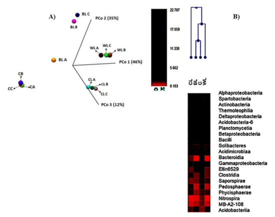 Principal coordinate analysis (PCoA) Euclidian beta diversity of the soil metagenomes (A), heat map and dendrogram (B) of the most abundant bacterial classes in the microbial community of soil samples.