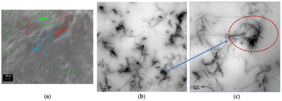 (a) FESEM image of PLLA_Lignin_MWCNT. PLLA matrix is indicated in red, and the areas containing lignin are shown in green. Blue arrows point at filament shapes, which are characteristic of MWCNT, (b,c) TEM images of PLLA_Lignin_MWCNT.