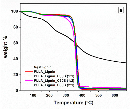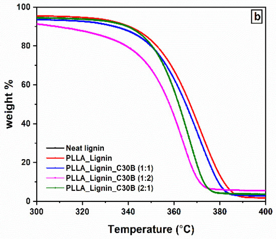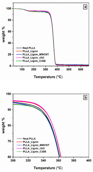 The T5% values are dispersed because of slight variations regarding the water content in the samples. T10% seems to be the most significant temperature at which to compare the thermal stability among nanocomposites, since it corresponds to the beginning of the matrix-degradation step (Figure 2b and Figure 3b). First, the addition of lignin seems to slightly improve the thermal stability, as expected [44]. Nanocomposites for which the lignin/nanofiller ratio is (1:1) show small differences in their TGA profile. Some are consistent with previous results from the literature [45,46], e.g., rGO improves the thermal stability, whereas MWCNT induces the opposite effect. On the other hand, our results show accelerated degradation with the addition of C30B in contrast to the reported stabilizing effects [47]. The antagonist actions of both lignin and C30B are highlighted by modifying their ratio. T10% shifts to higher values in PLLA_Lignin_C30B (2:1) but severely drops in PLLA_Lignin_C30B (1:2).