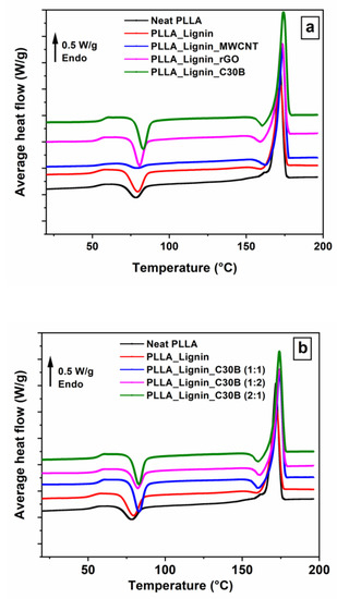 The results presented in Figure 4a and Table 1 highlight that only PLLA_Lignin_MWCNT crystallized more than neat PLLA under cooling from the melt. According to Hu et al. [46], carbon nanotubes are more efficient nucleating agents than rGO. Barrau et al. [49] proposed that the high specific surface of carbon nanotubes implies a large number of nucleation sites. Therefore, the crystallization rate, and consequently Xc, can be adjusted according to the choice of the filler. The results obtained for PLLA_Lignin_C30B show that additional control can be managed by modifying the filler/lignin ratio. This is interesting for industrial production, for which the cooling rate is not easily adjustable.