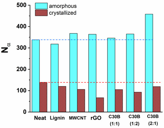 First, Nα decreased from about 340 to 140 by annealing neat PLLA, as expected. Xc and XRAF crystal were similar between samples, but Nα was the highest for neat PLLA. A comparison among PLLA_Lignin_C30B materials revealed that this decrease in the CRR size was not related to the lignin, but to the nanofiller. Finally, Nα depends on the nature of the nanofiller. It reached the lowest value of 67 for PLLA_Lignin_rGO. Considering that Xc and XRAF crystal are similar between samples, this could reasonably indicate that the crystalline morphology differs. It has already been reported that PLA-based nanocomposites containing rGO nanoflakes are characterized by very imperfect crystals in comparison to neat PLLA [45]. For equally high measurements of Xc and XRAF crystal, a decrease in the long period, i.e., in the spacing between adjacent crystalline lamellae layers, will result in a more efficient propagation of the mobility restriction from the crystal to the mobile amorphous through the RAF. To summarize, the results obtained for amorphous nanocomposites confirm the role of lignin as a promoter of interfacial interactions because the calorimetric response is highly sensitive to intermolecular interactions. On the other hand, the microstructure and the morphology govern the glass-transition signature in semi-crystalline nanocomposites, which is consistent with previous observations [34,52].