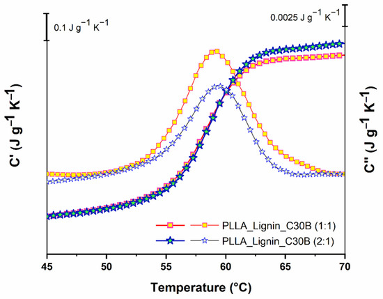 To explain the increase of ΔCp and Nα, we assumed a successful exfoliation [34], which favored intermolecular interactions without generating XRAF filler, i.e., XRAF filler was equal to zero. Recently, Szymoniak et al. also reported an increase of ΔCp in epoxy-based nanocomposites [50], reaching an optimum before falling with the increase of the filler content, probably due to the competition existing between the creation of interactions and the mobility restrictions. According to our results, Nα is equal to 458 in PLLA_Lignin_C30B (2:1). Figure 6 shows C′ and C″ signals for this system and PLLA_Lignin_C30B (1:1) for comparison. Such an increase in Nα in comparison with neat PLLA exceeded our expectations. We assume that this characterizes the role of lignin as an interaction promoter in hybrid nanocomposites.