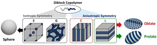 Given that the emulsion containing BCPs acts as a soft and mobile template, the spontaneous deformation of the particle shape is facilitated by bending and stretching of self-assembled polymer chains [,,]. As the microphase-separated structure of the BCPs inside the emulsion has a three-dimensional isotropic symmetry (i.e., spheres (S) or gyroid (G) phases), the resulting particles typically have a spherical shape (Figure 1, left) [,]. By contrast, oblate [,,] or prolate [,] ellipsoids are formed when BCPs having anisotropic symmetry (i.e., cylinders (C) or lamellae (L)) are confined in emulsions (Figure 1, right). In detail, the total free energy change (ΔG) for the structural development of the BCP particle is expressed as a combination of terms describing (i) the entropic penalty associated with BCP chain stretching upon elongation (ΔGent), (ii) the interfacial energy between two blocks of BCPs (ΔGint), (iii) the entropic penalty of bending BCP chains near the edge of the particles (ΔGben), and (iv) the surface energy between the BCPs and the surrounding aqueous medium (ΔGsur) [,]. This counterbalance of these contributions to minimize the overall free energy determines the final shape of the BCP particles.