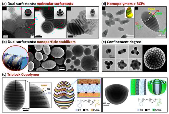 Another unique system neutralizes surface interaction of triblock copolymers (triBCPs) to generate non-spherical particles with three-phase domains (Figure 2c). For example, a mixture of CTAB and poly(vinyl alcohol) (PVA) provides a neutral interaction for PS-b-PI-b-P2VP triBCPs (PI: polyisoprene), affording the formation of prolate shape []. Confinement assembly of ABC triblock terpolymers has been further reported by varying the type of each block: PS-b-PB-b-PMMA, PS-b-PB-b-PtBMA, and PS-b-P4VP-b-PtBMA (PMMA: poly(methyl methacrylate), PtBMA: poly(t-butyl methacrylate)) [,]. Under spherical confinement stabilized by CTAB, the PS-b-PB-b-PtBMA triblock terpolymer adopts a hemispherical shape with a mixture of concentric lamella–axial lamella morphology []. Cross-linking and disassembly of the microparticles further resulted in well-defined nanorings or Janus nanocups with different chemistries on the inside and outside. While microphase diagrams provide a fairly extensive opportunity to search for morphologies found only in ABC triblock polymers, it still remains a great challenge for the synthetic screening of all possible block compositions.