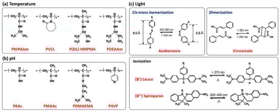 Examples of molecular structures responsive to (a) temperature, (b) pH, and (c) light (reprinted with permission from [], Copyright 2010, Elsevier).