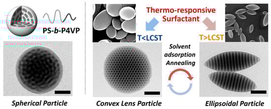 A well-known polymer with lower critical solution temperature (LCST) behavior is poly(N-isopropylacrylamide) (PNIPAM), which exhibits the coil-to-globule phase transition at 32 °C [,]. Lee et al. reported temperature-driven shape transformation of PS-b-P4VP particles by utilizing PNIPAM surfactants (Figure 4) []. In this system, PNIPAM stabilized the oil-in-water emulsions as a P4VP-selective surfactant, creating a near-neutral interface between the PS and P4VP domains with CTAB, and anisotropic PS-b-P4VP particles (i.e., prolate and oblate particles) were realized. Importantly, the temperature-directed arrangement of PNIPAM according to its solubility determined the overall shape of the BCP particles. Prolate particles were produced above the critical temperature, whereas oblate particles were obtained below the critical temperature. The temperature window of the particle shape transition was widely adjustable by developing other PNIPAM derivatives with different LCST values (i.e., poly(N-n-propylacrylamide) (PNNPAM) and poly(N-isopropylmethacrylamide) (PNIPMAM)).