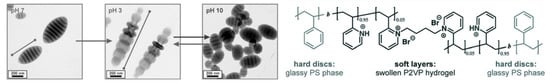 A typical structure of a pH-sensitive polymer involves ionizable groups that undergo reversible ionization at different pH values, causing pH-dependent swelling/deswelling behavior. In this case, the hydrophobic volume along the polymer chain may alternately extend or collapse due to electrostatic repulsions between generated charges [,]. Klinger et al. reported prolate PS-b-P2VP particles, where the cross-linked hydrogel P2VP layers enabled a reversible anisotropic shape transformation of the whole ellipsoidal particles (more than twice along the major axis) in response to a pH change (Figure 5) [].