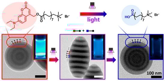 Light-responsive shape-changing PS-b-P2VP particles (i.e., from onion to prolate or oblate ellipsoids) were developed by using surfactants containing photocleavable nitrobenzyl ester or coumarin ester groups by Kim’s group (Figure 6) []. The cleavage of surfactants induced sequential modulation of the amphiphilicity and interfacial activity of the surfactants (i.e., interaction between surfactants and each block), leading to the modification of the surface and wetting properties of BCP particles. The use of a mixture of two photo-responsive surfactants that exhibit different activation wavelengths (i.e., 254 and 420 nm) afforded wavelength-selective shape transformations of the BCP particles. Adding reversible properties to photoactive surfactants (i.e., photochromic units that can be reversibly isomerized between different states when exposed to light) would result in completely reversible and dynamic changes in particle shape and properties, greatly expanding its usefulness for other practical applications.