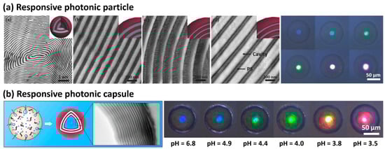 (a) Solvent-responsive photonic particles of PS-b-P2VP comprising concentric lamellae (reprinted with permission from [], Copyright 2018, Wiley-VCH). (b) pH-responsive photonic crystal microcapsules of PS-b-P2VP with parallel lamellar layers (reprinted with permission from [], Copyright 2020, American Chemical Society).