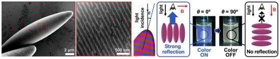 An external field, such as an electric field and magnetic field, can be applied to manipulate the orientation and movement of particles in the desired manner. Recently, photonic ellipsoids functionalized with magnetic NPs were developed by the Swager group to explore a real-time on/off coloration activated by the magnetic field (Figure 8) []. The photonic ellipsoids were designed by use of dendronized brush block copolymers composed of alkyl wedge groups and benzyl wedge groups (poly(AW-b-BnW) den-BBCP), where the full-color reflection was achieved by tuning overall molecular weights. Surfactants composed of dendritic monomer units enabled precise modulation of the interfacial properties of the polymer particles from spheres to ellipsoids. Due to the shape anisotropy of the ellipsoids, the photonic behavior of the prolate particles with axially-stacked lamellae was strongly dependent on the angle of incident light to the photonic layers, which cannot be observed in spherical photonic particles with concentric lamellae. The magnetic field-assisted orientation-dependent photonic behavior was explored, achieving a real-time switchable on/off color response.