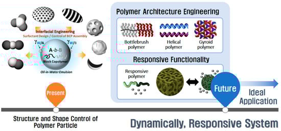While stimuli-responsive surfactants have received a great deal of attention due to their tunable chemical, physical, and other properties in response to a variety of external stimuli, the manufacturing of dynamic BCP particles that uses responsive surfactants to control their shape and structure remains relatively unexplored. Systematic research on the development of surfactants is required to create smart particles that respond highly reversibly to multiple stimuli without any fatigue during multiple cycles. We also note that most responsive polymer particles require solvent-mediated reconstruction to provide sufficient chain mobility. The use of polymers having a low glass transition temperature (Tg) or cross-linkable units will be a promising alternative approach. Moreover, although some research on non-linear polymer assemblies has been investigated recently, there remains a need for polymer particle design principles for new architectures (Figure 9). Polymer architecture plays a significant role in controlling the assembly structure as well as its responsive behavior. Spiral polymers and gyroid polymers, for example, are two of the promising prospects for designing directional release systems in response to external stimuli. Finally, the unique structural functionality, i.e., biodegradable BCPs, can be expanded by modifying their compositions.