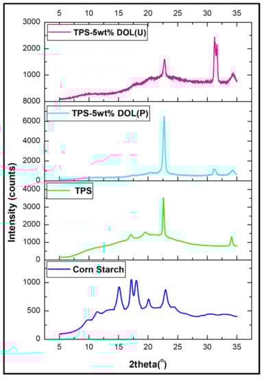 4.4. Crystallinity Analysis of the Corn Starch, TPS Film, and TPS-DOL Biocomposite Films