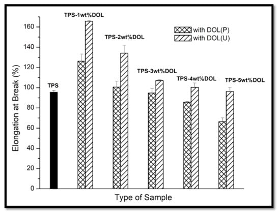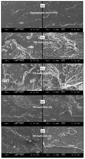4.7. Morphology of Tensile Fractured Surface of the TPS Film and TPS-DOL Biocomposites